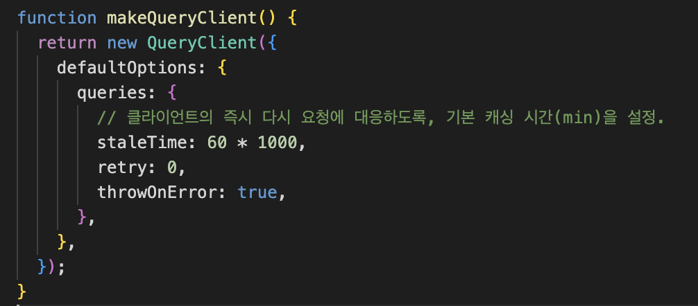 useQuery에 throwOnError 옵션을 하나하나 설정하는건 비효율적이기 때문에 QueryClient를 설정할 때 defaultOptions에 기본 재시도 횟수를 설정하여 전역적으로 useQuery에 Error Boundary가 적용되도록 하였다.